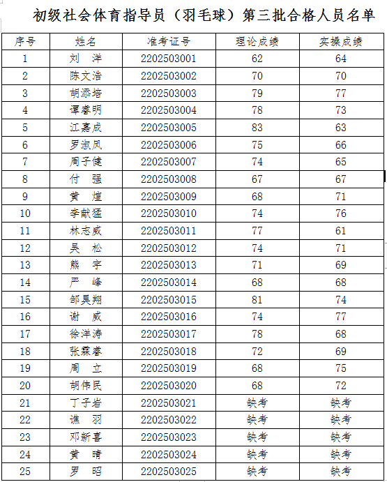 根據(jù)《江西省人力資源和社會保障廳關(guān)于公布江西省第二批職業(yè)技能等級認(rèn)定社會培訓(xùn)評價組織的通知》(贛人社字〔2022〕128號)文件精神,以社會體育指導(dǎo)員《國家職業(yè)資格》作為評價標(biāo)準(zhǔn),2022年12月29日組織開展初級社會體育指導(dǎo)員(羽毛球)認(rèn)定工作,理論、實(shí)操考試應(yīng)考25人,實(shí)考20人,其中20人兩項(xiàng)成績均達(dá)60分(含)以上。